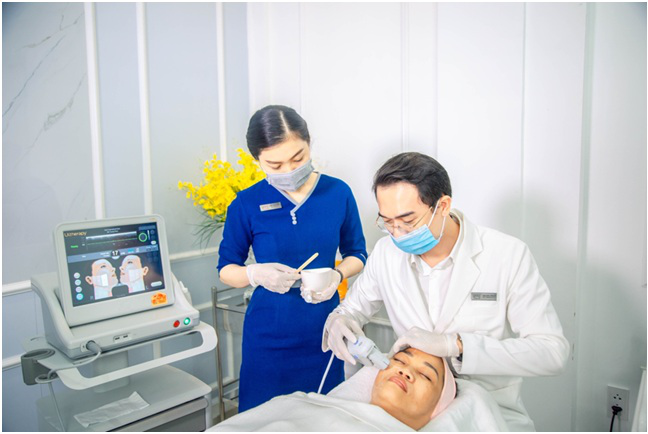 Bác sĩ Phạm Minh Trường khi chăm sóc da cho khách hàng.